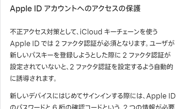 ちなみにApple IDは、同様に認証キーを保存できる「iCloudキーチェーン」の利用にあたり、2ファクタ認証を必須化しています。