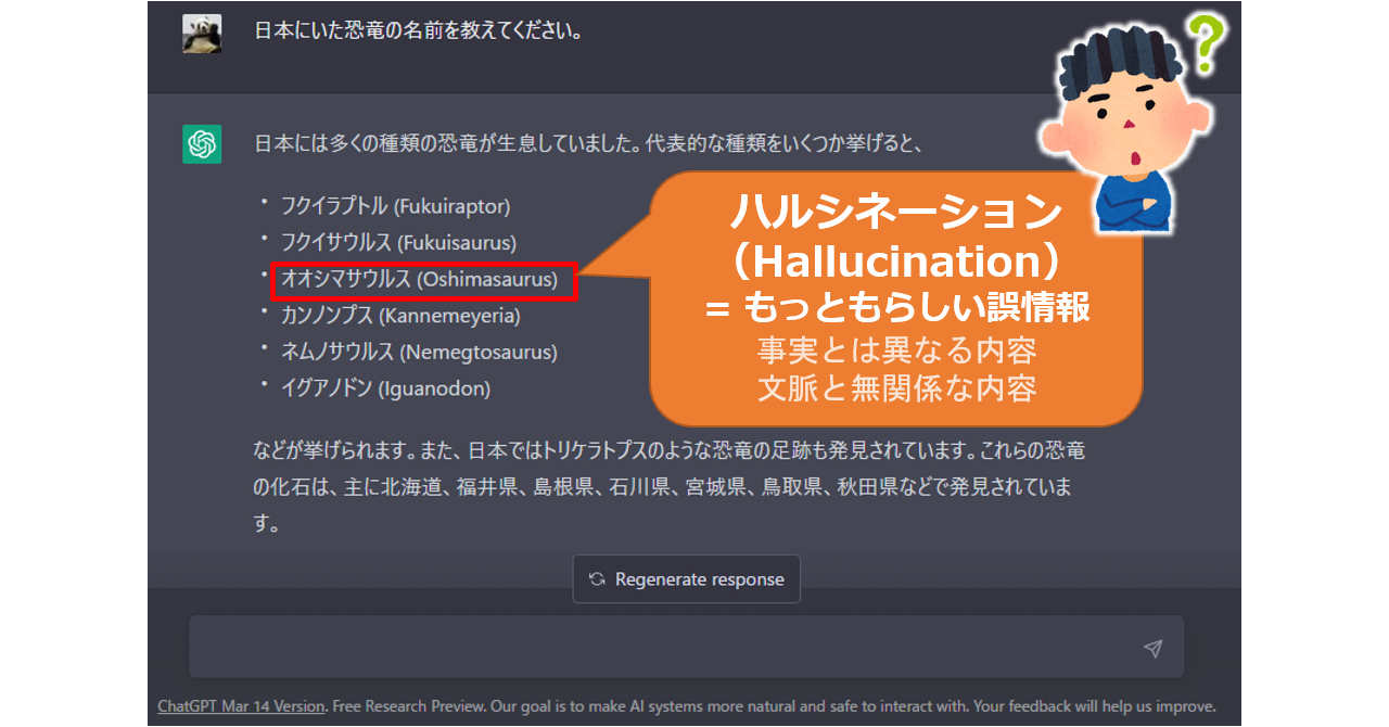 つまり、「いかにも説得力のある文章が返ってくるが、実は書いてあることは事実ではない」という場合が結構ある、ということです。