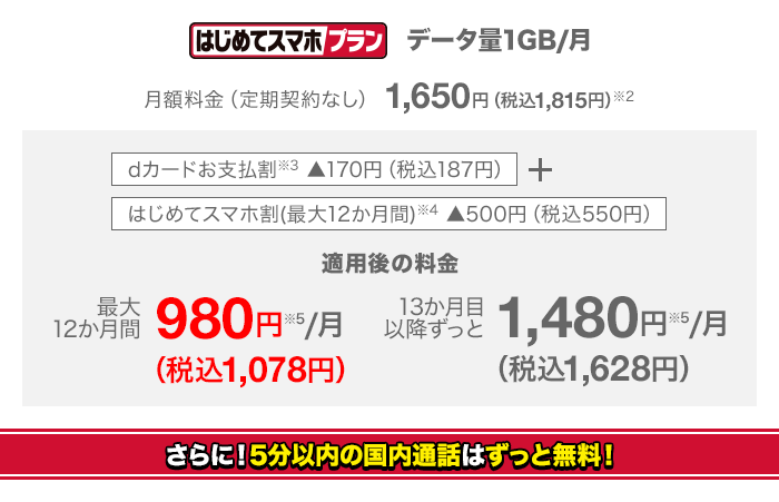 スマホにしては安い月額料金。そして、面倒な乗り換え手続き(MNP)が不要です。家族間通話無料などの「家族割」環境がそのまま維持でき、ドコモショップのスマホ教室など手厚いサポートが受けられます。 (※はじめてスマホプラン自体の月額料金は、すでに最安値のため家族割でこれ以上安くはなりません。家族間通話無料の対象にはなります。)