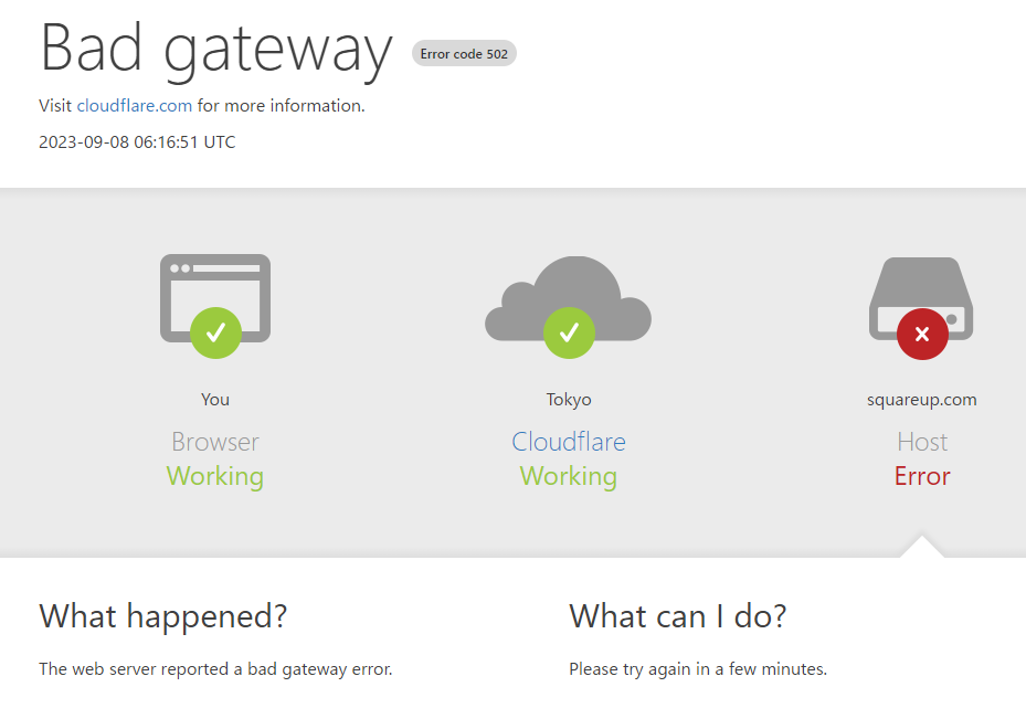 15:30ごろ、Squareデータの画面が、単に「アクセスできません」ではなく、Cloudflareのエラー画面が表示されるようになり