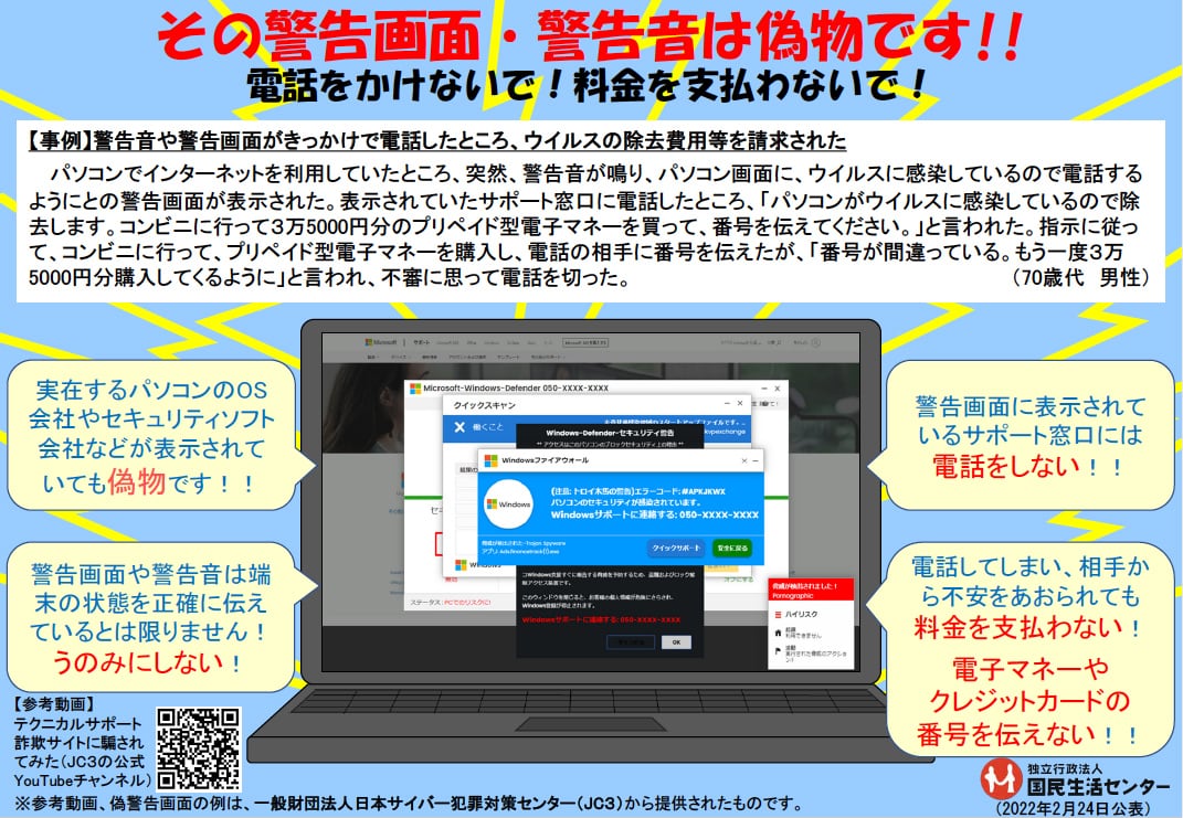 「ウイルスに感染しているかも」と思いこまされたこと自身も、詐欺の被害です